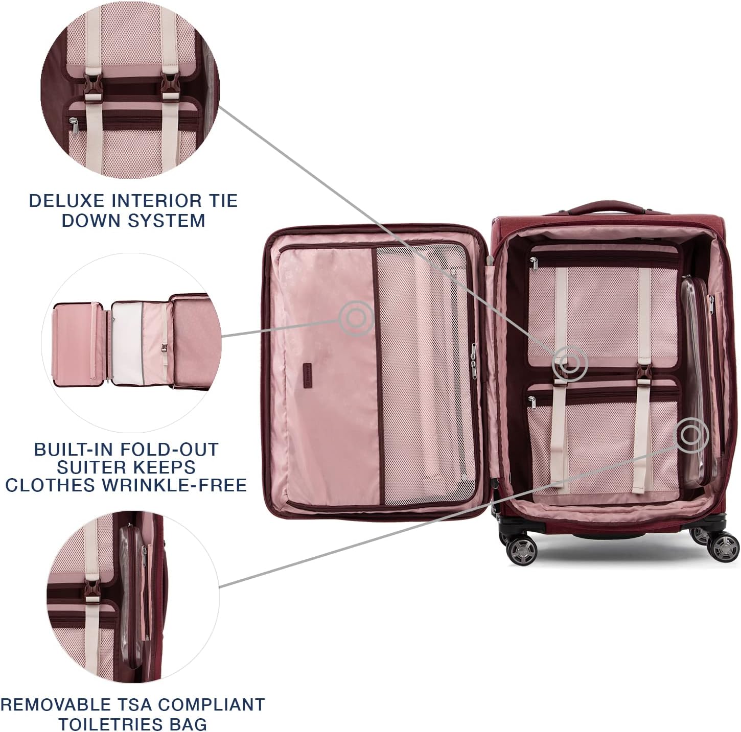 - WRINKLE FREE, ORGANIZED TRAVEL: Built-in suiter keeps clothes wrinkle free. Interior tie down system with accessory pockets and removable wet pocket help keep contents organized. Top, side and bottom carry handles provide carrying options