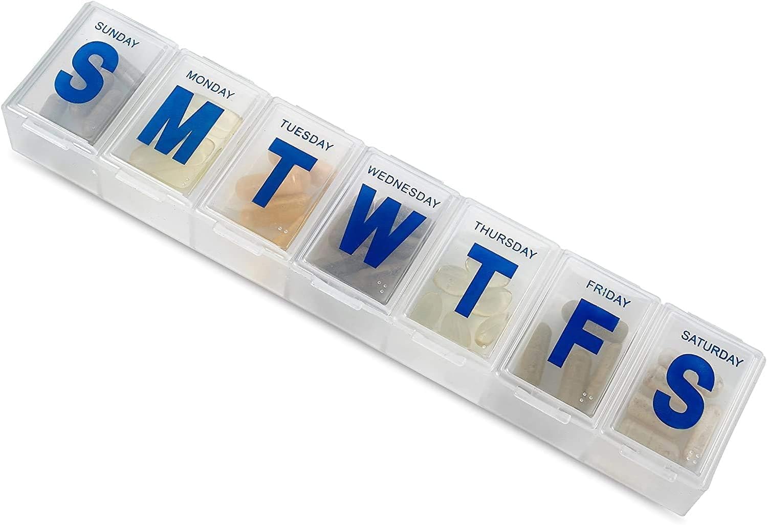 - ABSOLUTE MEDI-PLANNER: The pill reminder is translucent and every lid is labeled with one weekday, to help you plan your 7 day medication accurately.