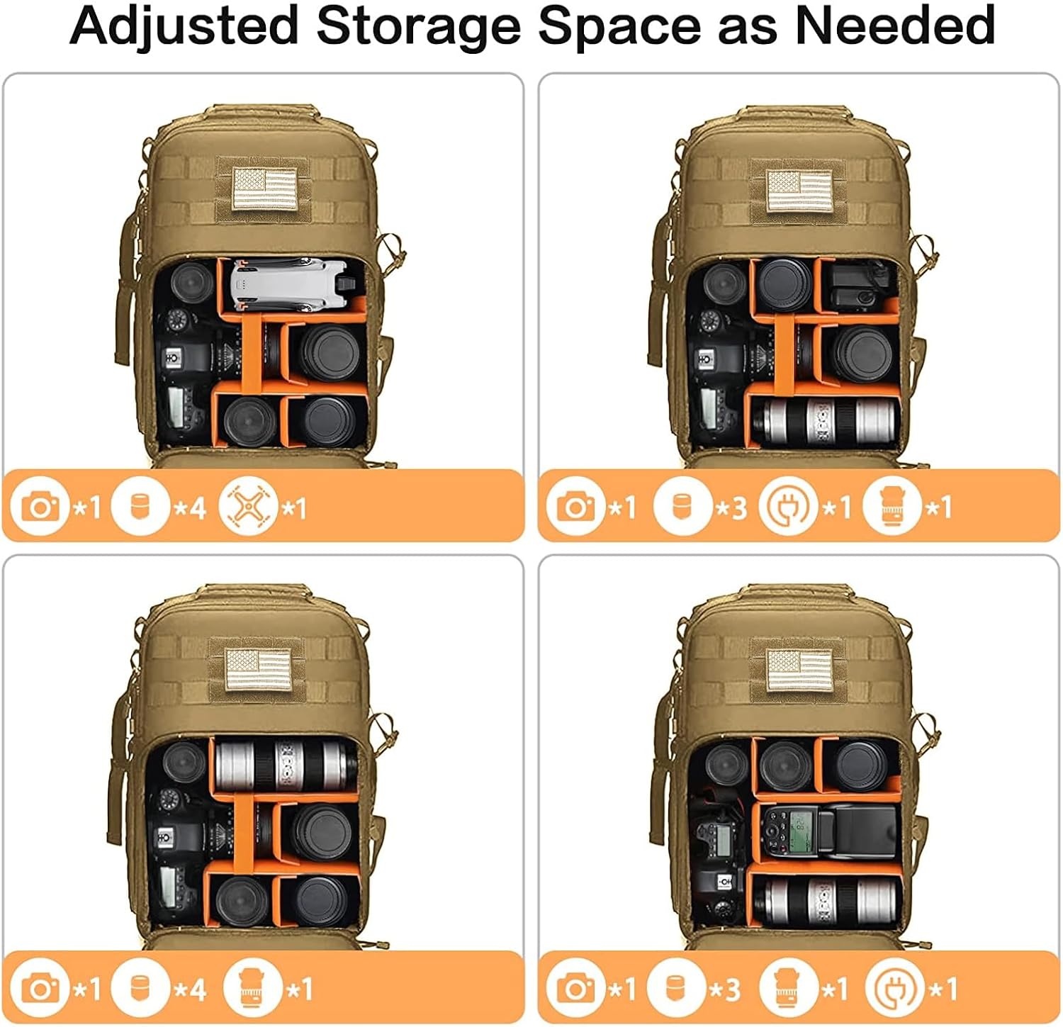 - This tactical camera backpack daypack is made of polyester material. A removable USA flag patch in front and webbing throughout whole bag can attach additional pouch or outdoor gear. Inner foam padded layer can provide good buffer and protection to your internal stuff against scratches, impact, shock and drops. Reinforcement edge & bottom with side load compression system, perfectly used in wild environment.
