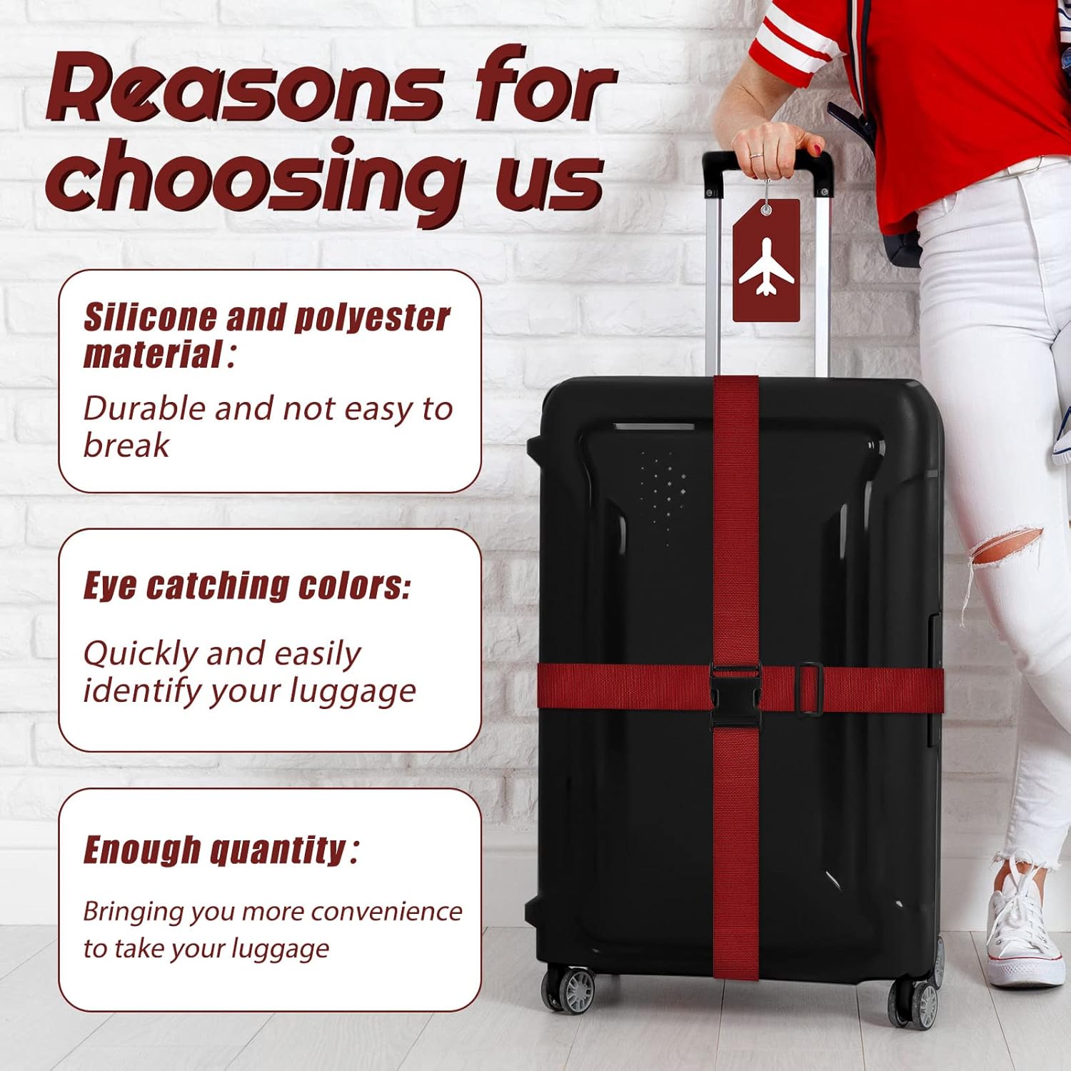 Weewooday 8 Pcs Luggage Straps Suitcase Tags Set for TSA Approved, 4 Travel Adjustable Suitcase Belt, 4 Silicone Luggage Tags with Name ID Card Travel Accessories(Wine Red,Airplane)