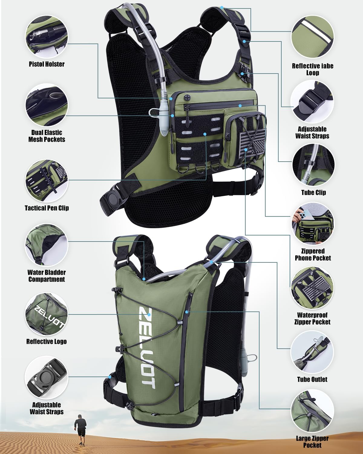 - Plenty of Storage - This chest bag features 3 waterproof zippered front pockets to securely hold essentials like your phone, keys, and energy gels. A detachable, bounce-free pistol holster ensures secure storage for small to mid-sized pistols, while the tactical pen slot keeps emergency gadgets within easy reach. Two large back pockets fit a water bladder, towel, extra clothing.